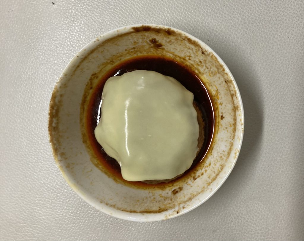 4.ハンバーグをひっくり返し、チーズをのせてね。電子レンジに2分かけ、中まで火が通ったらできあがり。