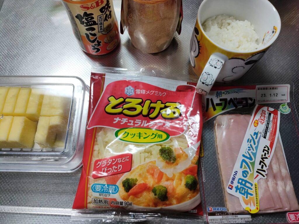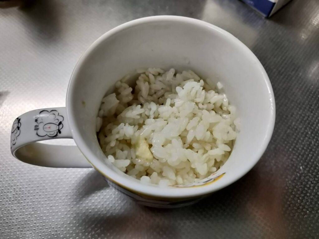 1.マグカップにごはん、バター、塩こしょう、コンソメを入れ、バターが溶けるまで混ぜる。
