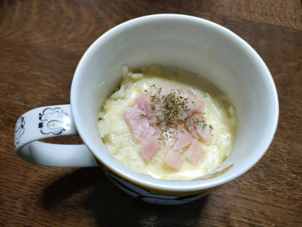 今回は小さめのマグカップで行ったけど、大きいグラタン用のお皿などを使ってもいいと思うー!。ちゃんとドリアの味がして美味しい!野菜を入れれば栄養価的にもいいと思うが、洗い物が増えるからやる気がある時は入れようかなあ笑