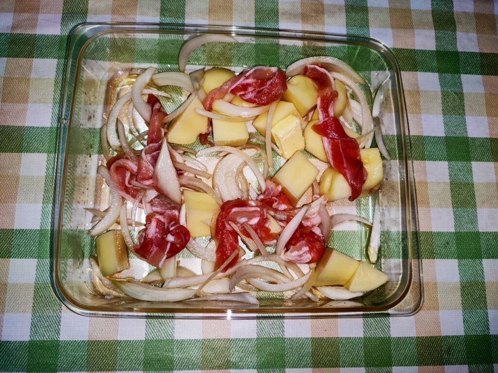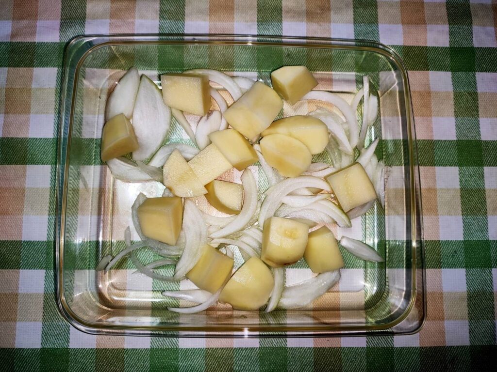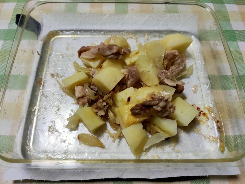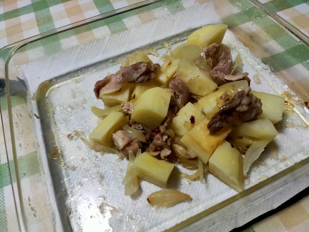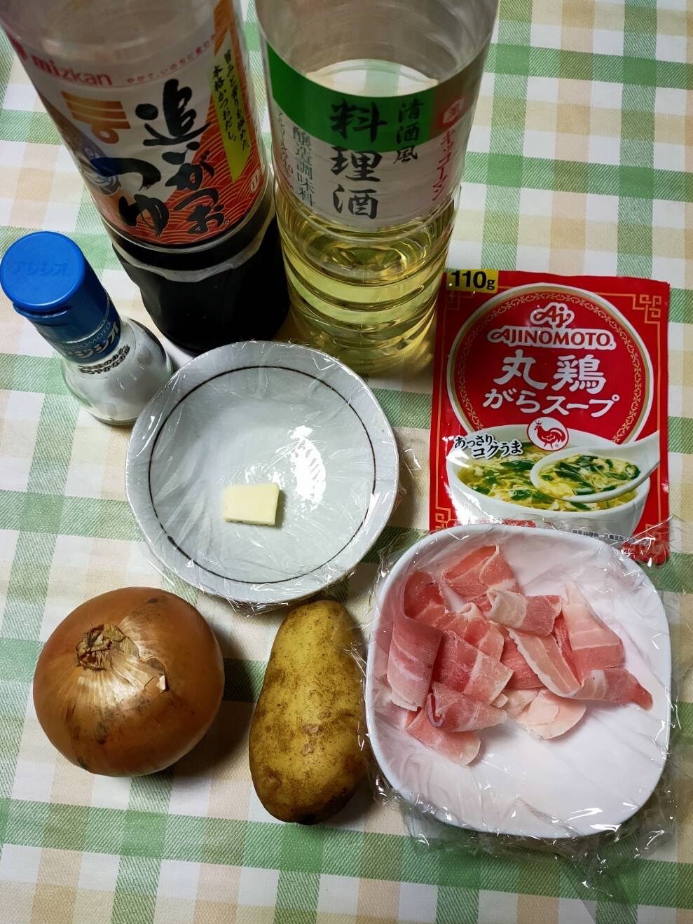 - じゃがいもは水洗いし、皮をむき3センチ角に切る。玉ねぎは皮をむき、薄切りにする。豚バラ肉は10センチ幅に切る