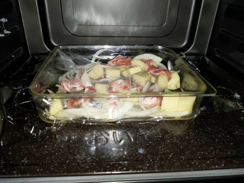 - ふんわりラップをかけ、600wの電子レンジで10~11分加熱してできあがり。(耐熱容器のフタをななめにかぶせるとラップの代わりになる)